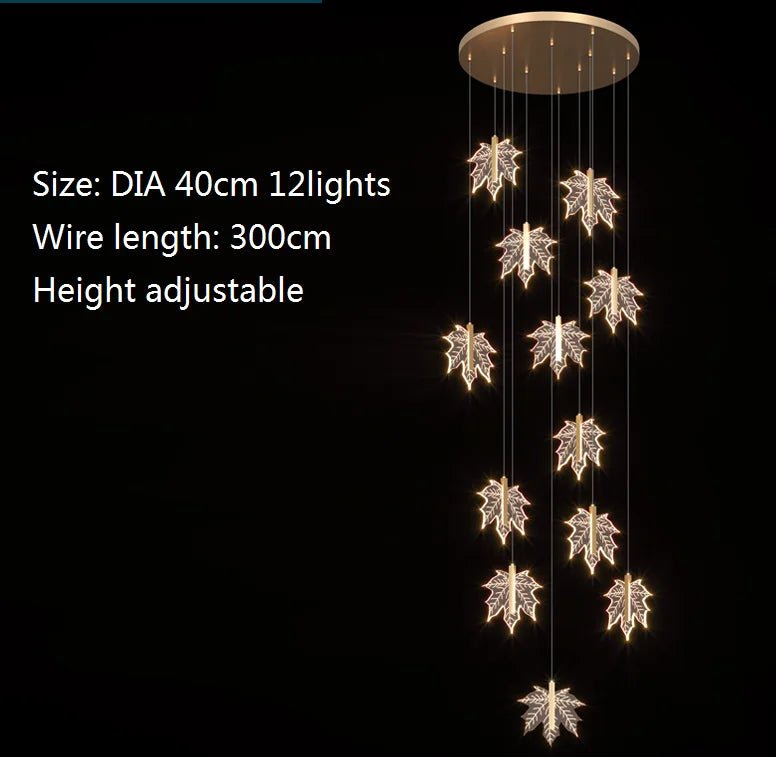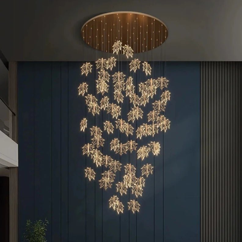 Contemporary Drummondii LED Staircase Chandelier by Lights of Scandinavia, inspired by the elegance of maple leaves, ideal for duplex building halls. Combines Nordic artistry with modern design and advanced LED technology to create an inviting ambiance.