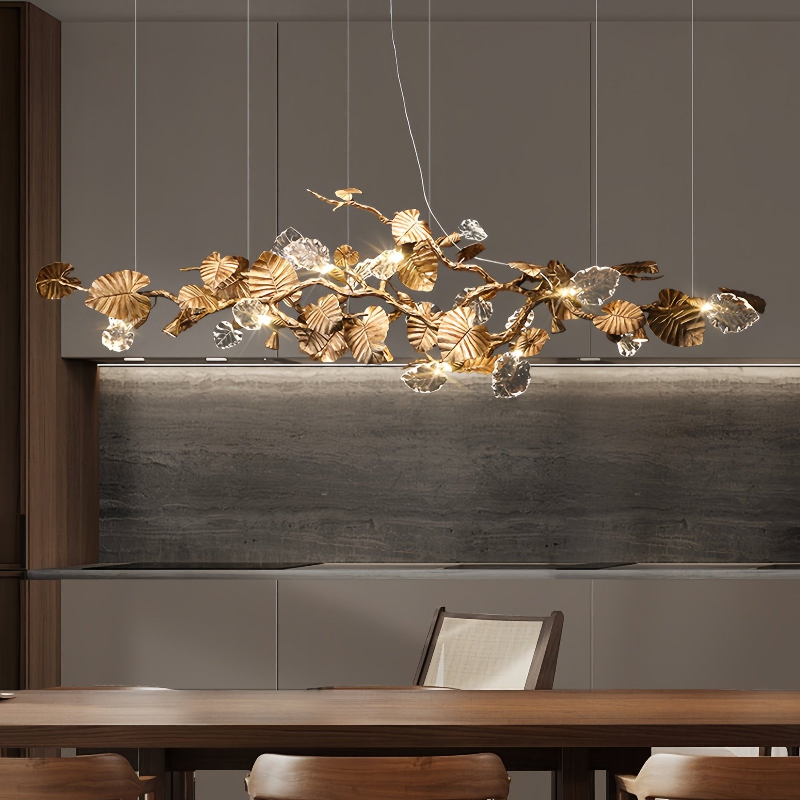 Elevate your space with the elegance of the Lotus chandelier, a masterful blend of nature and craftsmanship. This striking piece transforms your room into a serene escape, featuring delicate lotus leaf pendants, meticulously crafted from transparent material that captures and refracts light with a crystalline shimmer. Each leaf is attached to a slender, organic branch finished in a warm, brass copper, creating a luxurious contrast against the cool glow of the LED lights. Suspended gracefully, the Lotus becomes the centerpiece of any room, a symbol of purity and enlightenment.