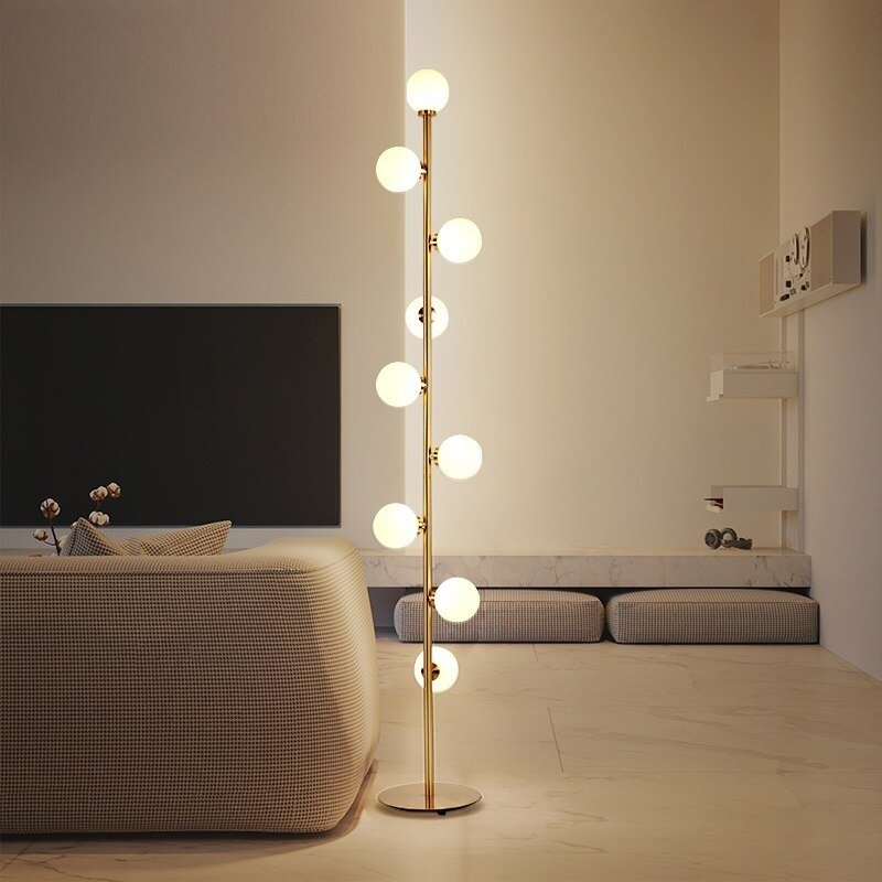 Modern LED standing lamp with frosted glass ball fixtures. Nickel gold plated steel body. Suitable for bedrooms, halls or why not next to a lonely wall.