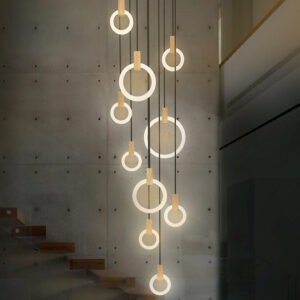Modern hanging stair LED chandelier. Perfect for creating a mood in any corner or in a stair. Aluminum/acrylic rings. Specifications